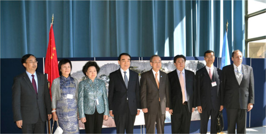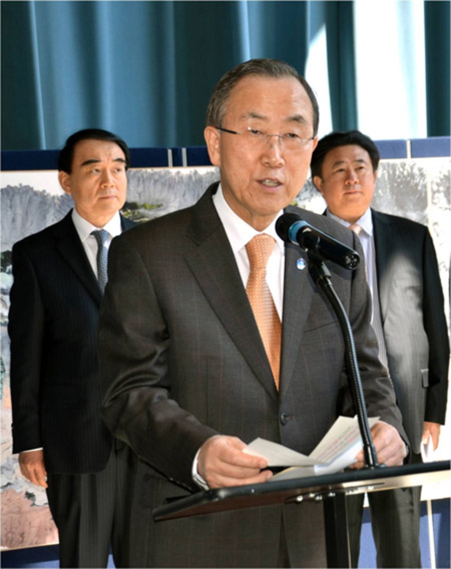 联合国潘基文秘书长首先致辞说:这两幅作品的立意非常符合联合国的工作主题。 《共同的家园》让我联想到联合国为在人类唯一的地球家园实现可持续发展所做的工作。《互动的世界》寓意联合国在充分利用世界互联互通方面所做的努力。当今世界有很多挑战是超越国界的。各国需要超越他们狭隘的利益,谋求世界的共同利益。这两幅画作规模宏大,是一个在联合国发挥重要作用,在谋求世界和平、人类繁荣发展方面发挥重要作用的国家赠送给联合国的大礼。我感谢中国对联合国和联合国基建总计划的慷慨支持。