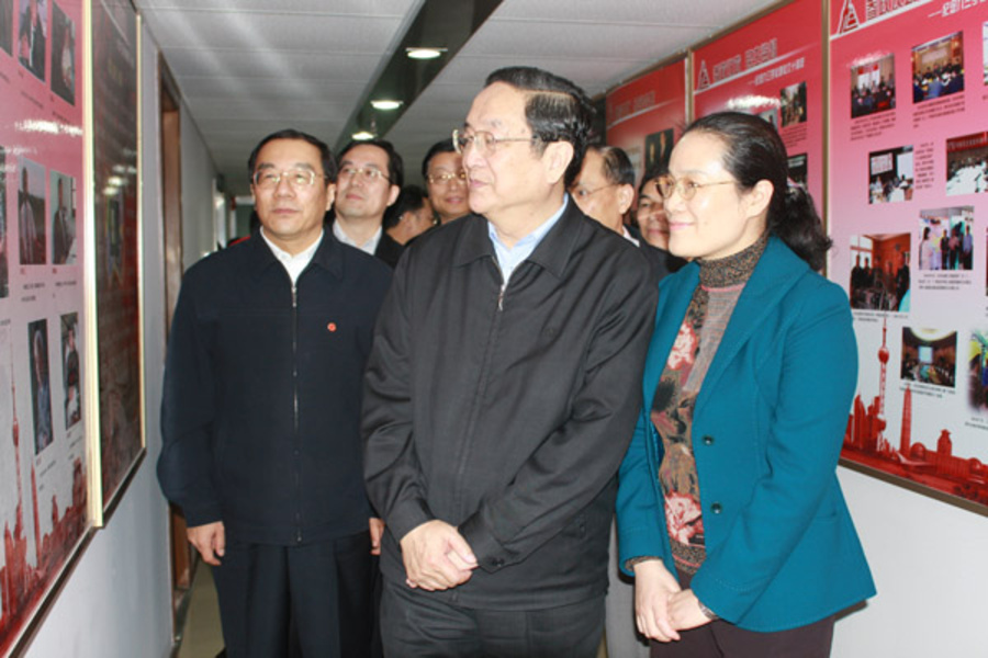 2007年10月,时任中共中央政治局委员、市委书记俞正声走访机关,与赵雯主委一同观看展板。