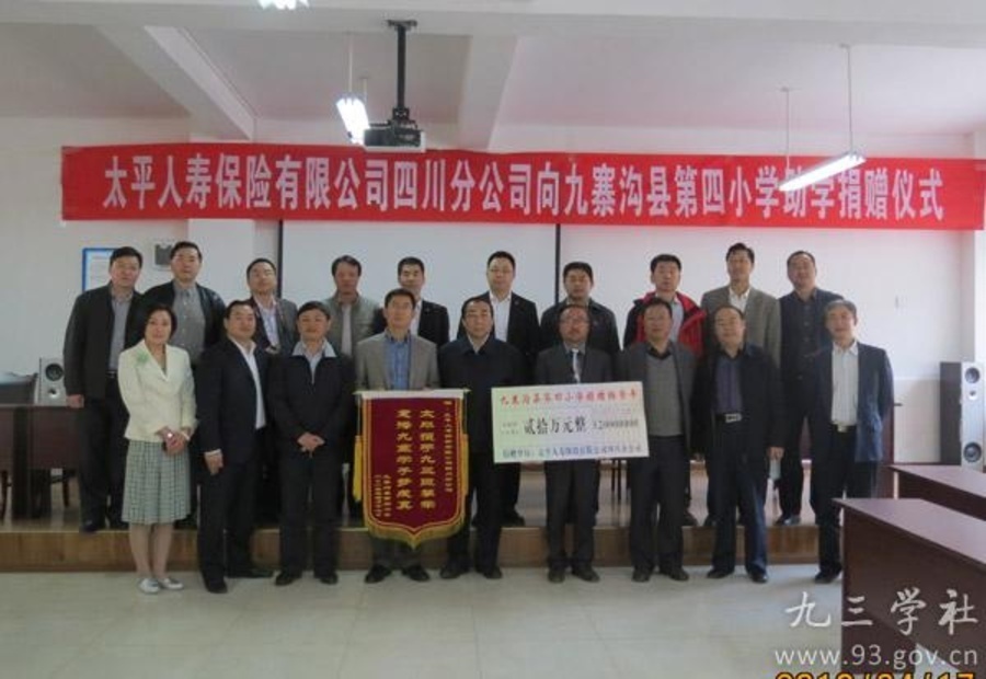 4月17日上午,九寨沟县第四小学会议室内春意融融,掌声阵阵,太平人寿四川分公司捐赠九寨沟县第四小学20万元的助学助教物资捐赠仪式在这里隆重举行。全国人大常委、九三学社中央副主席丛斌,全国人大常委、四川省政协副主席、九三学社四川省委主委黄润秋,九三学社中央社会服务部部长苟红旗,社四川省委委员徐玖平,社四川省委秘书长刘虹,阿坝州副州长杨绍林,九寨沟县县长李绍友,太平人寿保险有限公司四川分公司总经理杜晋涛,以及九寨沟县教育局、九寨沟县第四小学的相关领导出席了捐赠仪式。
