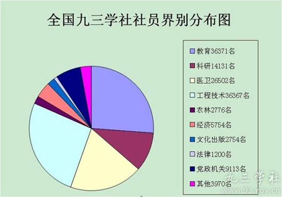 从社员界别分布看,高等教育和普通教育共有社员36371名,占社员总数的26.18%;科学研究14131名,占社员总数的10.17;医药卫生26502名,占社员的总数的19.07%;工程技术36367名,占社员总数的26.17%;党政机关9113名,占社员总数的6.56%;其余农林、财政经济、文化艺术、新闻出版、法律、其他有社员2776名、5754名、1716名、1038名、1200名、3970名,分别占社员总数的2%、4.14%、1.24%、0.75%、0.86%和2.86%。