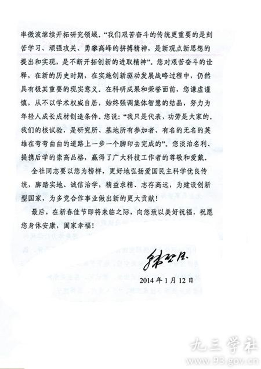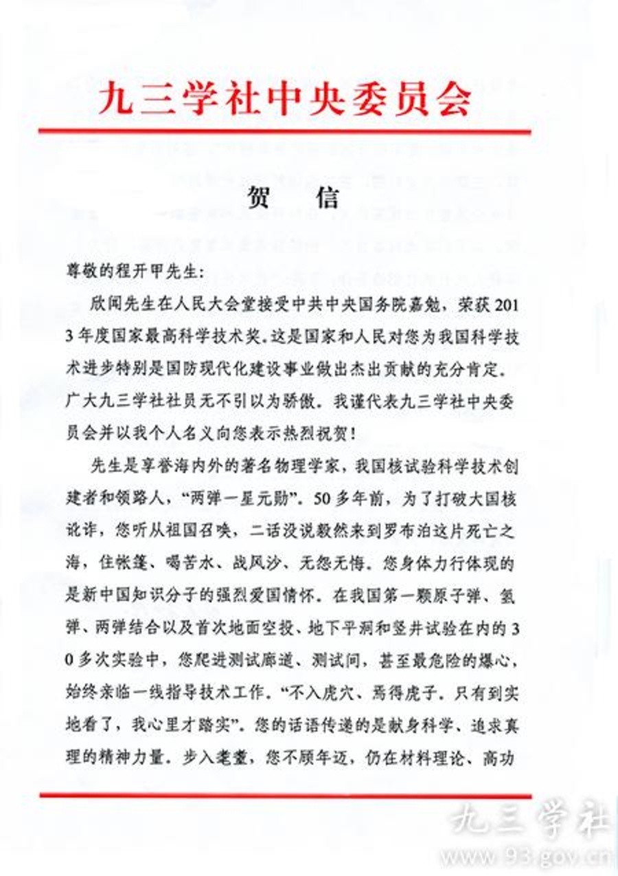 贺信说,欣闻先生在人民大会堂接受中共中央国务院嘉勉,荣获2013年度国家最高科学技术奖。这是国家和人民对您为我国科学技术进步特别是国防现代化建设事业做出杰出贡献的充分肯定。广大九三学社社员无不引以为骄傲。我谨代表九三学社中央委员会并以我个人名义向您表示热烈祝贺!