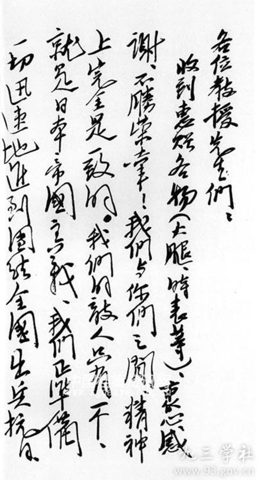 事实上,毛泽东当时曾给这些教授们写了一封信,全文是:各位教授先生们:收到惠赠各物(火腿、时表等)衷心感谢,不胜荣幸!我们与你们之间,精神上完全是一致的。我们的敌人只有一个,就是日本帝国主义,我们正准备一切迅速地进到团结全国出兵抗日,我们与你们见面之期已不远了。为驱逐日本帝国主义而奋斗,为中华民主共和国而奋斗,这是全国人民的旗帜,也就是我们与你们共同的旗帜!谨致民族革命的敬礼!毛泽东十一月二号。