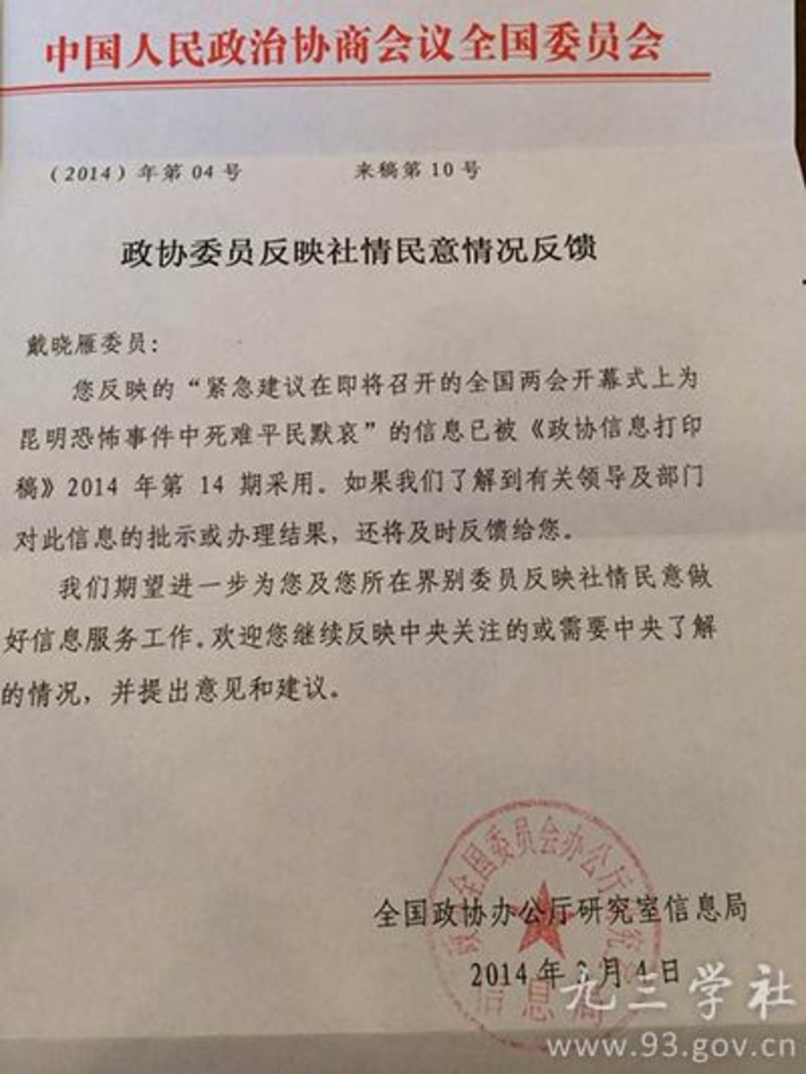 3月1日晚,云南昆明火车站爆发了震惊世人的暴力恐怖事件,造成29人死亡143人受伤。全国政协委员、九三学社四川省委副主委戴晓雁奋笔写下《紧急建议在即将召开的全国两会开幕式上为昆明恐怖事件中死难平民默哀》,于次日提交全国政协,并迅速得到全国政协办公厅关于采用该信息的回复。在3日和5日分别举行的全国政协和全国人大十二届二次会议开幕会上,全体与会人员与全国人民一道,为遇难民众致以沉痛的哀悼。(黄羽)