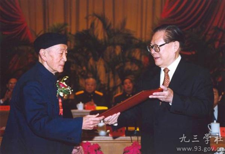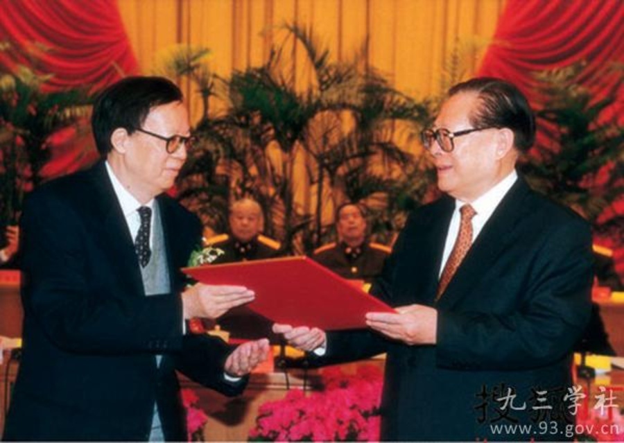 江泽民同志向黄昆先生颁发国家科学技术最高奖。