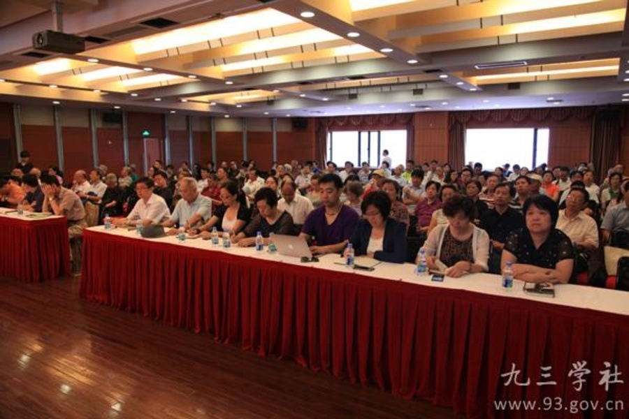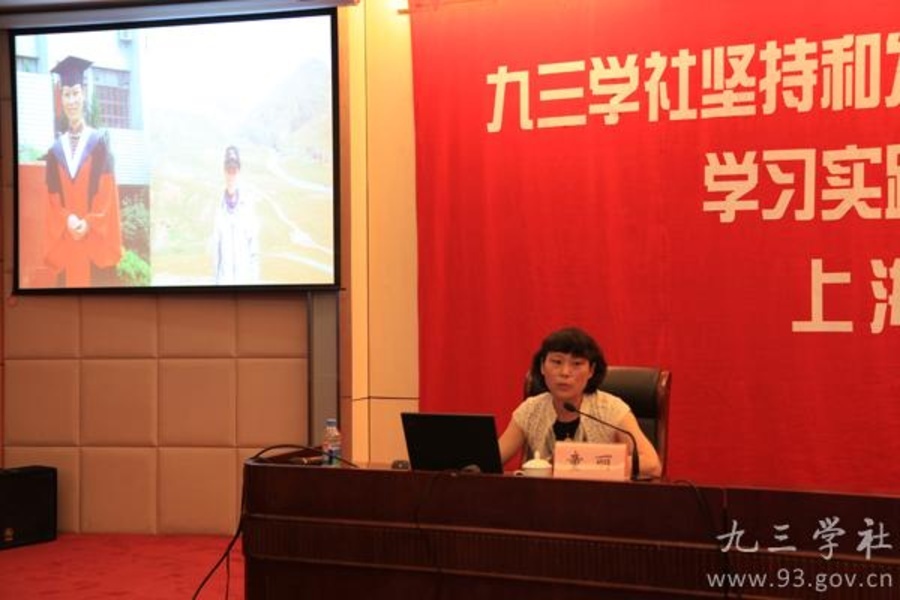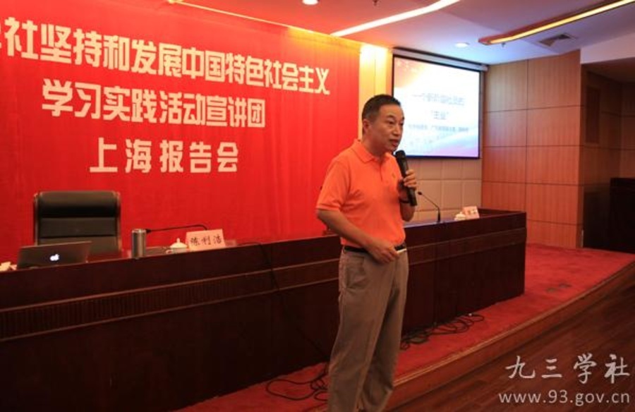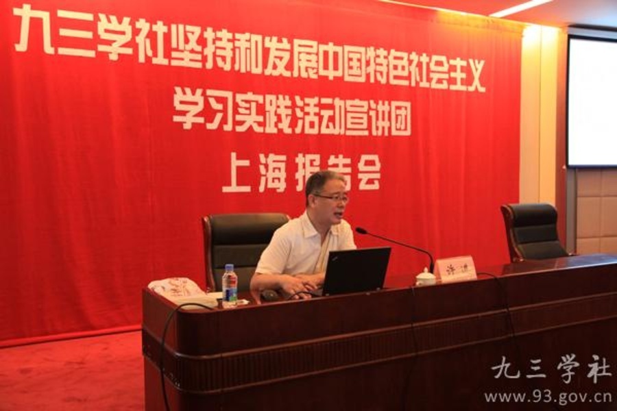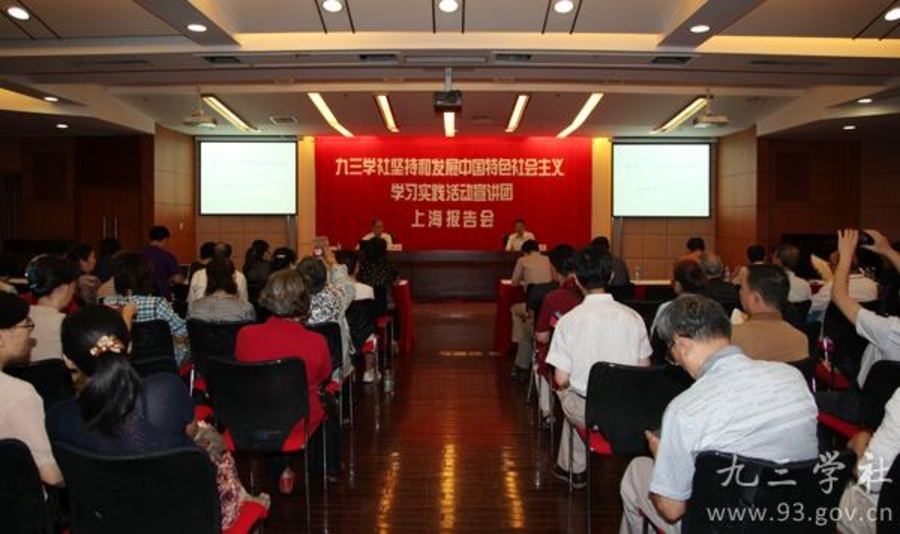 九三学社中央坚持和发展中国特色社会主义学习实践活动宣讲团上海报告会8月15日在上海民主党派大厦6楼会议厅举行。九三学社中央委员、九三学社中央思想建设研究中心和社史研究中心研究员、九三学社主要创始人许德珩之孙许进,九三学社中央委员、广东省委副主委、远光软件股份有限公司董事长陈利浩,全国青联委员、九三学社青海省委常委、青海大学医学院中藏药研究中心主任、医学博士童丽分别做主题报告。九三学社上海市委副主委周锋主持报告会,九三学社上海市委秘书长朱红及400余名在沪社员聆听了报告。