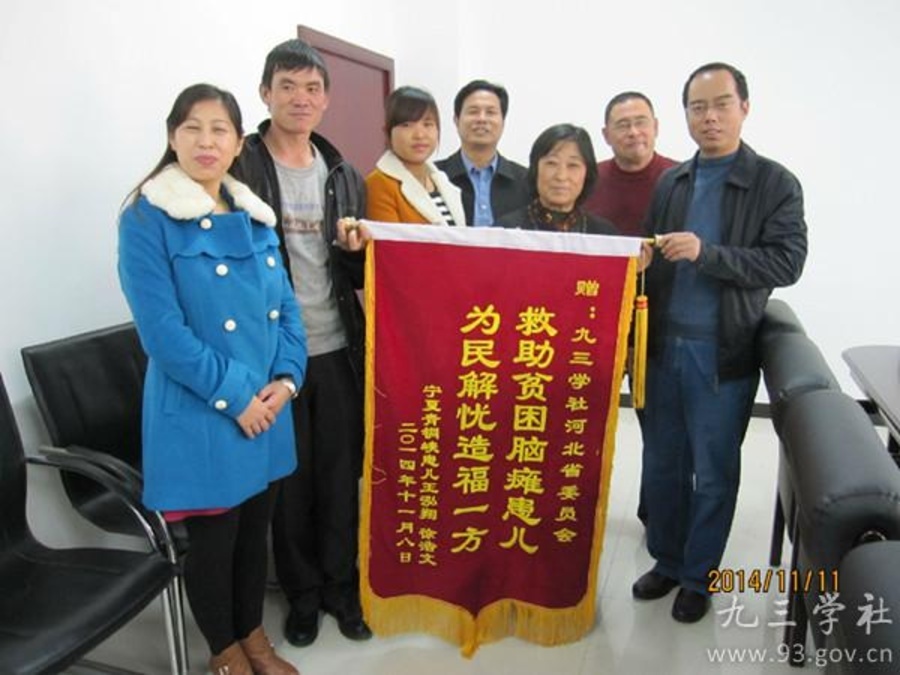 2014年11月11日,宁夏回族自治区青铜峡市两个脑瘫患儿王泓翔和徐浩文的家长抬着一面锦旗送到了副主委刘林平的手中。大红的锦旗上,“救助贫困脑瘫患儿,为民解忧造福一方”几个金色的大字闪闪发光。“真是太感谢你们了!为了孩子的病,我们是跑断了腿,花光了家底,可是这病一点也不见好。不瞒您说,我已经打算放弃治疗了……没想到在九三学社河北省委的帮助下,俺家孩子不花钱就治好了病。你们救了孩子,就是救了我们这个家啊!”徐浩文眼睛湿润,紧紧握着刘林平副主委的手激动地说。