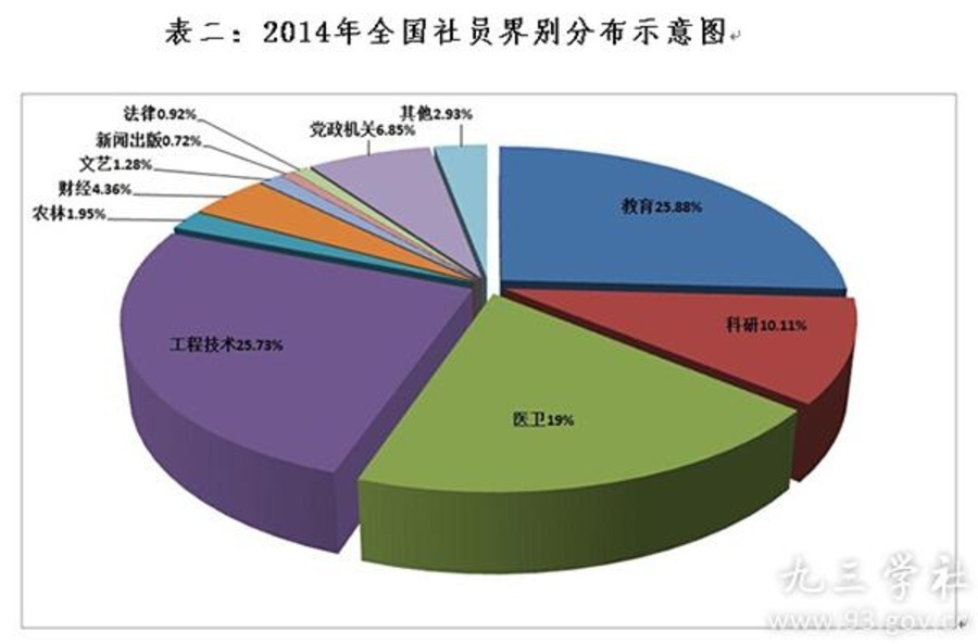 一是界别分布进一步优化。目前,九三学社社员共涉及教育、科研、医卫、工程技术、党政机关、农林、财经、文化艺术、新闻出版、法律等多个行业。其中,高等教育、工程技术、科研和医卫是九三学社主体界别,占社员总数的81%。其中,高等教育37631名,占总数的25.88%,比例最大;工程技术37427名,占总数的25.73%,位列第二;医卫28045名,占19.28%;科研14702名,占10.11%。