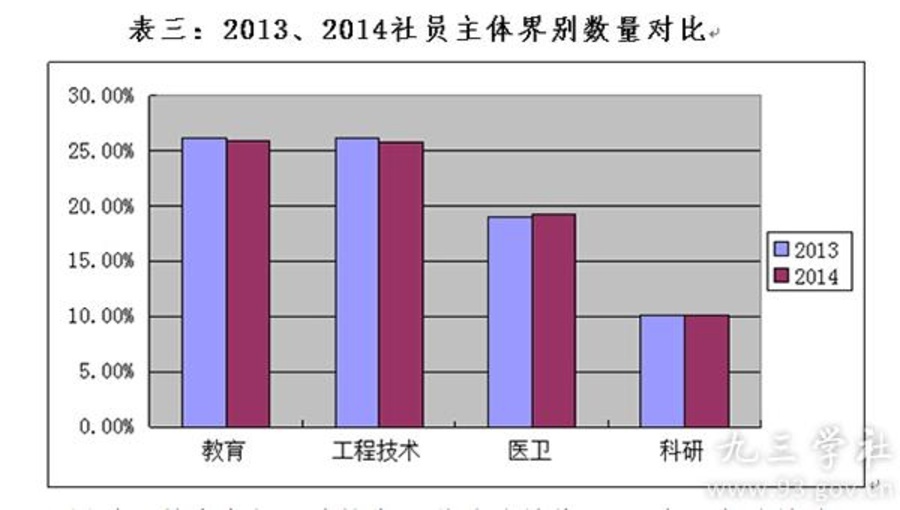 与去年同期相比,除医卫界社员数量增加0.21个百分点之外,高等教育、工程技术、科研等其他主要界别略有下降,整体降低0.59个百分点。
