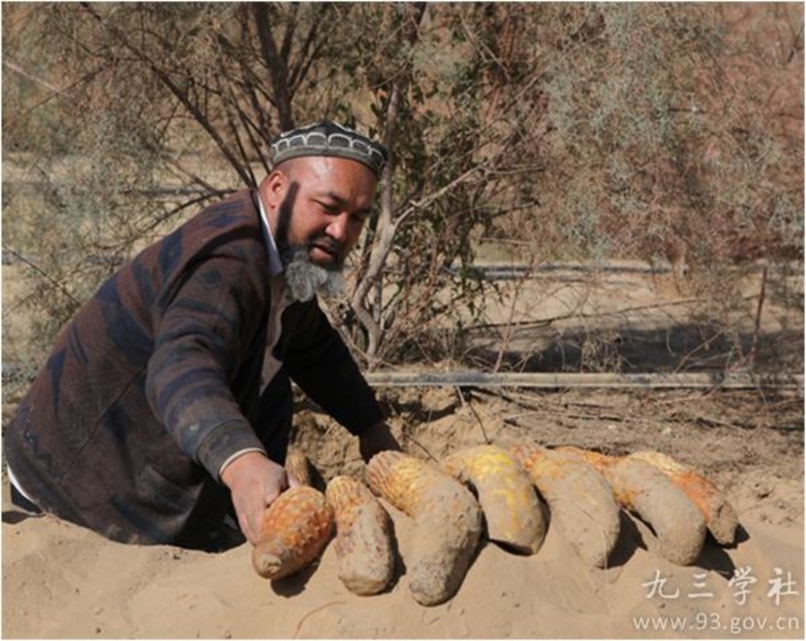 屠鹏飞找了几个维族老乡,大家拿着头部磨尖的铁棒,在红柳林下沙土鼓起的地方,不断向下穿插,深达30多公分,探测下面是否有肉苁蓉生长。经过1个多小时的寻找,终于找到了肉苁蓉,他兴奋极了,急忙照相,并用手轻轻扒开沙土,观察肉苁蓉的生长状况及其寄生情况。