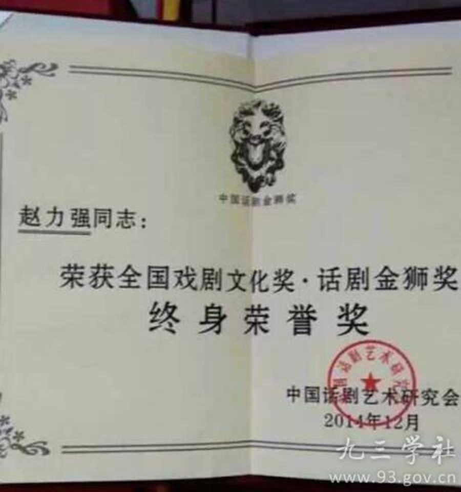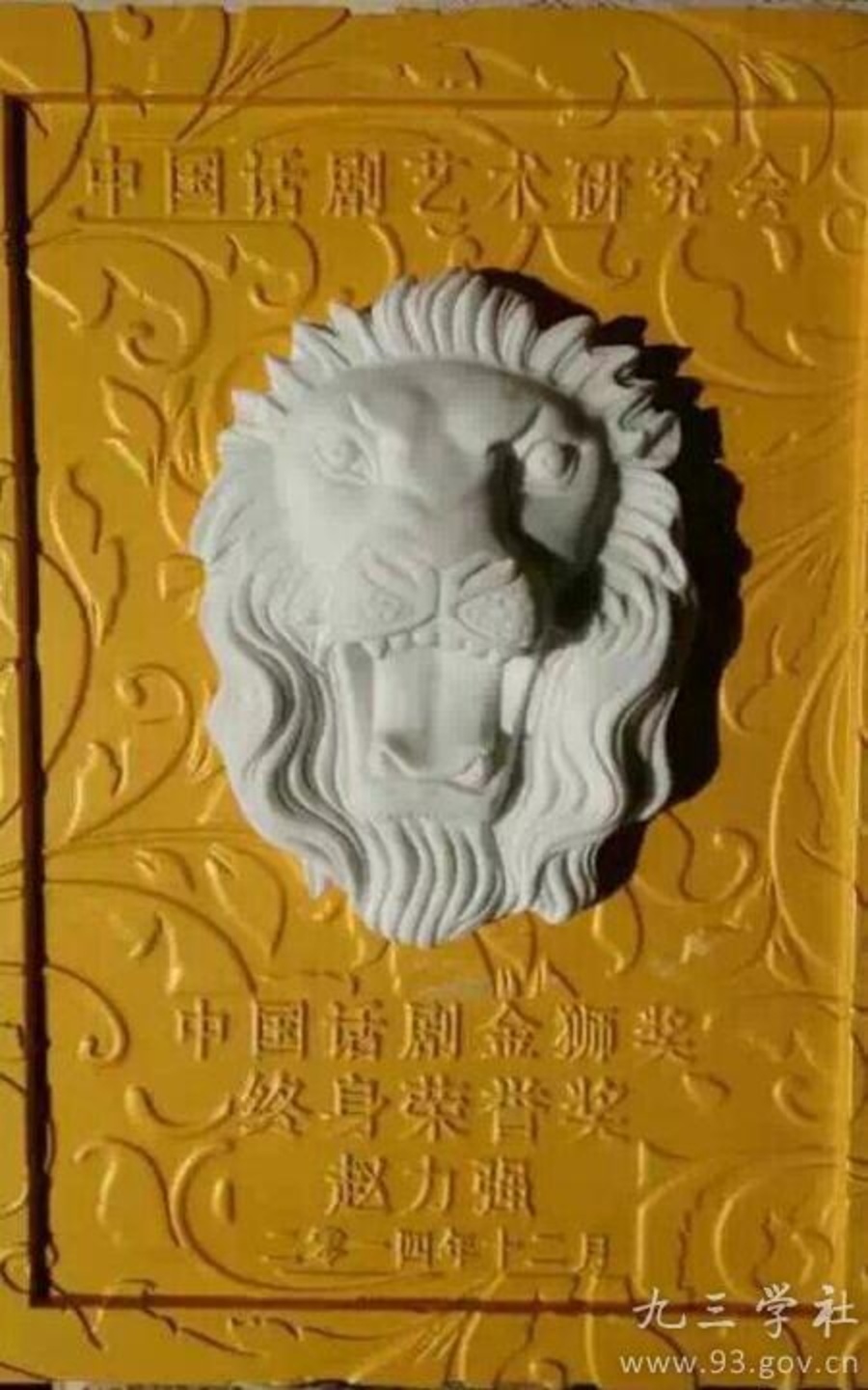 2014年12月28日,在新的一年即将来临之际,第九届中国话剧金狮奖颁奖典礼在山西太原隆重举办。陕西人民艺术剧院原院长、国家一级演员,九三学社中央委员、陕西省十一届政协常委、九三学社陕西省委副主委赵力强应邀出席颁奖典礼,并荣获中国话剧界最高奖“中国话剧金狮奖-终身荣誉奖”。作为话剧界的“奥斯卡”,能捧上一座“金狮”奖杯,是话剧人奋斗一辈子最梦寐以求的事情。从1989年至今,金狮奖已在北京举行过七届评奖活动,于是之、李默然、焦晃、葛优、袁泉、冯远征等666人先后获此殊荣。这次做为中国话研会副会长的赵力强,因工作原因,主动卸任副会长一职,为了表彰他为推动中国话剧艺术研究会、陕西话剧事业的发展和繁荣所做出的卓越贡献,中国话剧艺术研究会特别授予赵力强话剧界最高奖项:“中国话剧金狮奖-终身荣誉奖”。