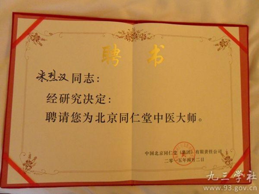 为更好地发挥名老中医专家学术专长和临床实践经验的作用,推动弘扬同仁堂中医药文化,开展宣传、传承、学术交流,促进系统医疗板块的发展。2015年4月10日,北京同仁堂在京隆重举行“北京同仁堂中医大师”命名仪式大会。北京市中医药管理局等单位领导参加命名仪式并为全国19位中医大师颁发证书。我社国家级名老中医、中国老年学学会常务理事、长安米氏内科流派代表传承人、原九三学社中央委员、陕西省副主委米烈汉教授被命名为“北京同仁堂中医大师”称号,这也是西北五省唯一被授予这一称号的专家。(戴红)