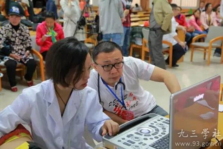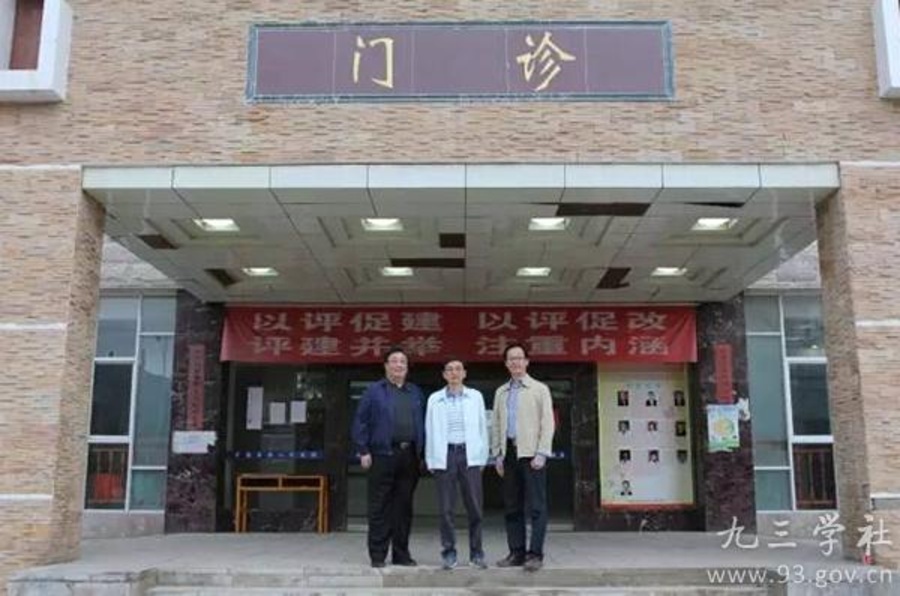 九三学社广东省委主委姚志彬(中)到香格里拉人民医院看望参加此次活动的九三学社社员。