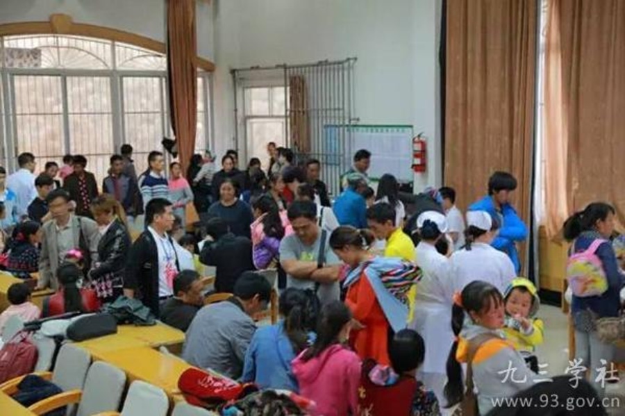 8月5日上午,团队来到丽江市人民医院进行筛查,大批家长在此等候,人数远超预期,检查地点临时搬到医院召开全院大会的地方。