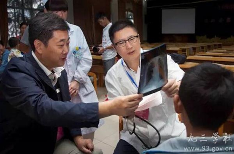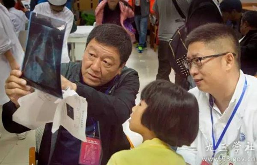 九三学社深圳市委医药卫生专委主任刘学恒(左)观察患儿胸片。