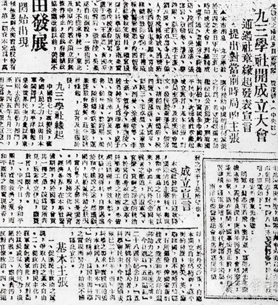 1946年5月4日,九三学社在重庆召开成立大会。大会发表了《九三学社缘起》、《成立宣言》、《基本主张》、《对时局主张》等文件,并选举王卓然、许德珩、严希纯、李士豪、吴藻溪、张西曼、张迦陵、张雪岩、孟宪章、涂长望、黄国璋、笪移今、彭饬三、税西恒、褚辅成、潘菽为理事,卢于道、刘及辰、何鲁、陈剑鞘、侯外庐、梁希、詹熊来、黎锦熙为监事。这是当时重庆《新华日报》的有关报道。