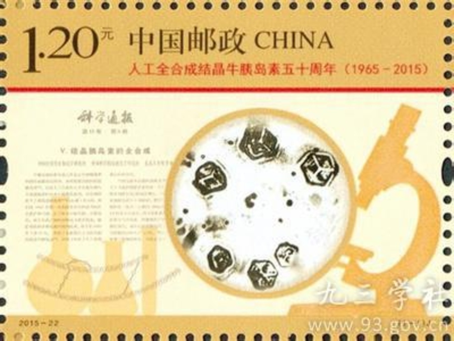 “人工全合成结晶牛胰岛素50周年”纪念邮票首发式,9月17日在此项成果“诞生地”——中国科学院上海生命科学研究院举行。《人工全合成结晶牛胰岛素50周年》纪念邮票1套1枚,面值为1.20 元。邮票主体图案为显微镜下人工全合成牛胰岛素结晶,背景为胰岛素分子一级结构图、实验用具和发表论文首页。画面整体设计科学严谨、简洁朴素,直观展现了这一举世瞩目科研成果。