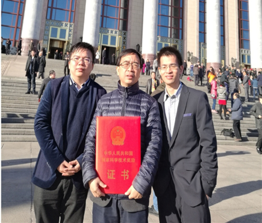 潘建伟(中)和陆朝阳(右)手捧获奖证书在人民大会堂前留影