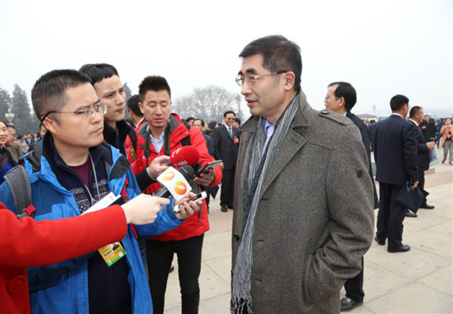 全国政协委员、九三学社中央常委、湖南省委主委张大方(右)接受媒体采访