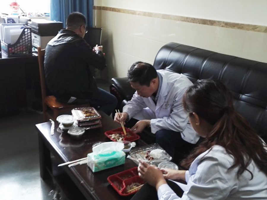游国师院长在忙着协调医护人员工作的同时,也不时抽空出来到走廊里了解患者的情况,看到还有那么多患者还没有做筛查,他赶忙通知专家们,取消中午的休息时间,午饭改为就地吃盒饭,而且为了保证工作不间断,医护人员的盒饭也是轮流着吃。