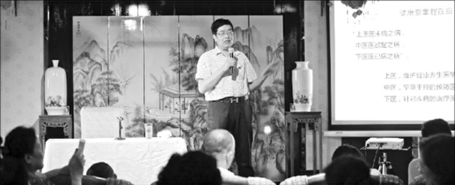 图为赵东科在养生微讲堂启动仪式上讲授健康知识。