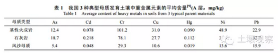 20 世纪 80 年代进行的中国土壤元素背景值调查结果表明,不同类型母质上发育的土壤,其重金属含量的差异很大,如 As、Cd、Cr、Cu、Hg、Ni 和 Pb 等元素在基性火成岩和石灰岩母质发育的土壤中的平均含量大大高于风沙母质土壤。