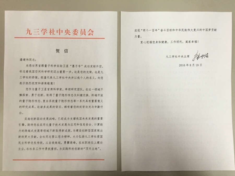 信中说,欣悉世界首颗量子科学实验卫星“墨子号”成功发射升空,标志着我国空间科学研究迈出重要一步。这是您的光荣,也是九三学社的骄傲。我谨代表九三学社中央并以我个人的名义,向您表示热烈祝贺和崇高敬意!