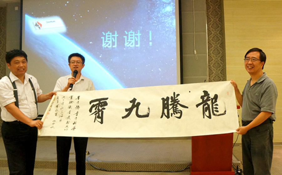 九三学社安徽省委专职副主委张腊梅宣读并向潘建伟转交了九三学社中央主席韩启德的贺信;九三学社上海市委专职副主委周锋代表九三学社上海市委向潘建伟表示祝贺,并赠送了来自青年社员、书法家盛兰军的书法作品“龙腾九霄”。