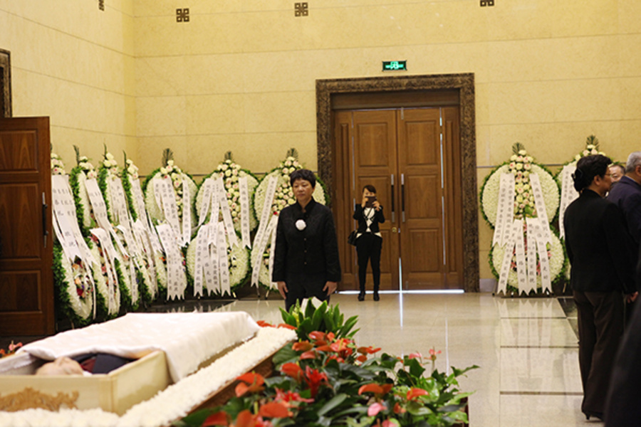 殡仪馆东礼堂内庄重肃穆,哀乐低回。大厅上方悬挂着黑底白字横幅——“沉痛悼念徐采栋同志”,横幅下方是徐采栋同志的遗像,四周摆满了各界人士敬献的花圈。徐采栋同志的遗体安卧在鲜花翠柏丛中。
