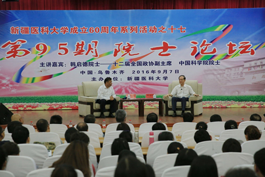 在新疆医科大学,韩启德就高校在“一带一路”战略中如何发挥作用展开调研并与学生座谈。韩启德强调两点,一是高度认同新疆医大的办学思路。新疆医科大学关于新疆特殊环境与健康学、新疆特色药材学、包虫病学、中维西医结合学、新疆少数民族特高发心血管疾病学、新疆少数民族特高发肿瘤学等6个重点特色学科的定位非常好,是与内地大学区分的具有地域特色的标志性学科;二是抓住成为中亚地区国家医疗和教育中心建设的机遇。新疆医大承担着与内地大学不同的特殊作用,甚至将来影响的范围可以从中亚扩大到整个欧亚大陆。站在战略思想的高地,从问题和任务出发,通过医学进步和医疗卫生事业发展,加强与“一带一路”沿线国家的交流与合作。