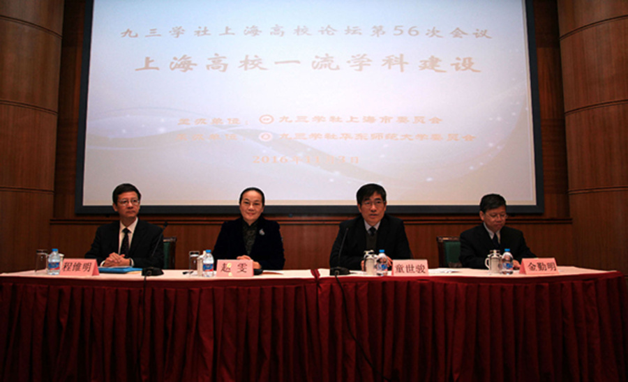 11月3日,九三学社上海高校论坛第56次会议在华东师范大学召开,来自上海10多所大学的九三学社社员围绕“上海高校一流学科建设”的主题进行了研讨。九三学社中央副主席、上海市副市长、社上海市委主委赵雯出席并讲话,华东师范大学党委书记童世骏到会祝贺。