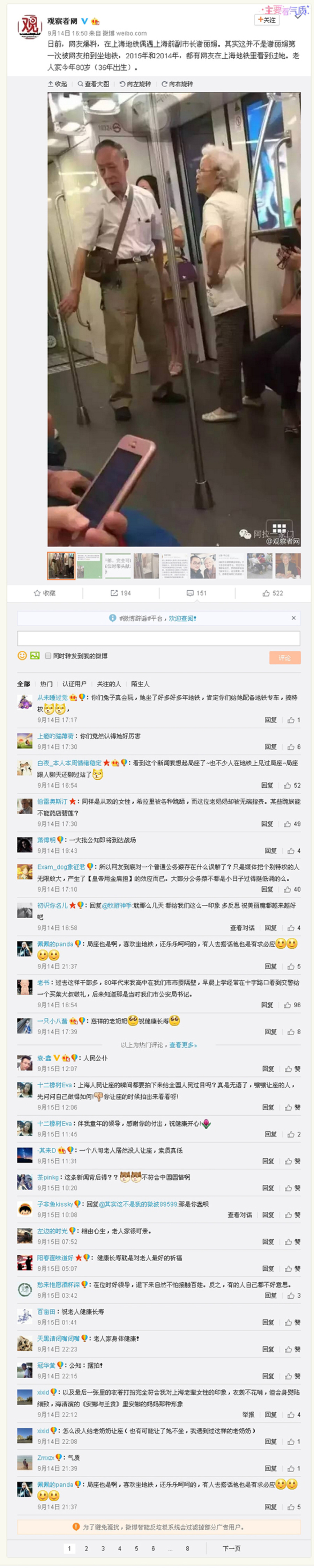 9月13日,一位网友在上海地铁偶遇年逾8旬的九三学社中央原副主席、上海市委原主委、上海市原副市长谢丽娟与普通乘客一样候车、乘车,便随手拍了两张照片发到网上,随即引发网友热议。各大新闻网站和商业网站纷纷转载,不少移动新闻客户端和公众微信号也纷纷转发。大家无不为谢丽娟身体力行、廉洁奉公的做法点赞。其实,退休后的谢丽娟经常乘公共交通工具出行,只是这一次被网友注意到而已。