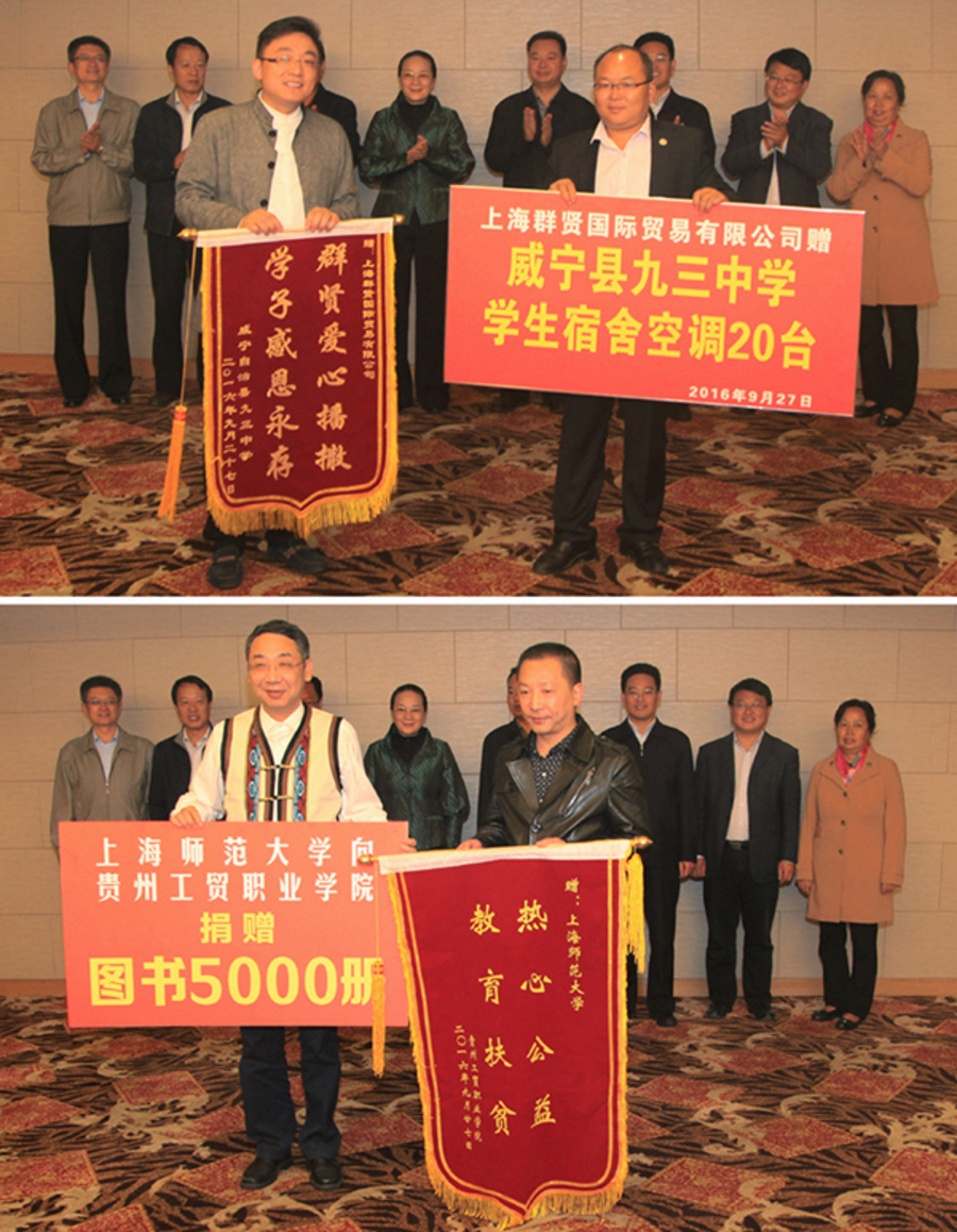 座谈会上,上海群贤国际贸易有限公司总经理林烨向威宁县九三中学捐赠空调20台,九三学社中央委员、上海师范大学校长朱自强代表上海师范大学向贵州工贸职业学院捐赠图书5000册。