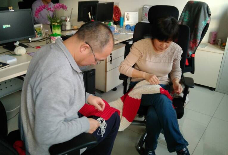 爱心有时是一种势不可挡的力量。机关所有女同志们在不放松对本职工作要求的同时,踊跃投身到爱心编织的大军中。大家不仅在工作日的休息时间里,切磋技术,提高技巧,还牺牲了许多节假日的闲暇时光。期间发生的令人感动的事情不胜枚举。张瑛、郭培君、闫士萍等,对作品精益求精,为了达到理想效果,不惜多次返工;办公厅的洪柳,在全面负责社中央全会的后勤保障工作之余,仍抓紧时间赶工,短短几天里就完成了1件毛衣、3顶帽子和1条围巾;蒋承华不仅自己动手,还动员老母亲共同参加。年逾七旬的老人家很快也献上自己的爱心答卷--1件毛衣、1条围巾;刘晓卿于2016年9月来到河北省平山县北冶乡作了一名支教老师,在辅导完孩子们的晚自习后,大山深处唯一那盏亮灯下,是她在编织的身影;李海英边学边织,手疼得不行就贴上膏药继续埋头苦干;组织部的陈晓英,对织洗熨等一系列流程完成的一丝不苟;人事处的李凡、宣传部的杨琴冬子由于频繁出差,无暇动手,就争取到了各自母亲的有力支援。许多奇巧精美的作品都出自这两位母亲之手;参政议政部的马小霞、刘凤霞、田萌、胡译戈等人,在积极备战全国两会的间隙,不仅亲自动手,还发动亲属帮忙……