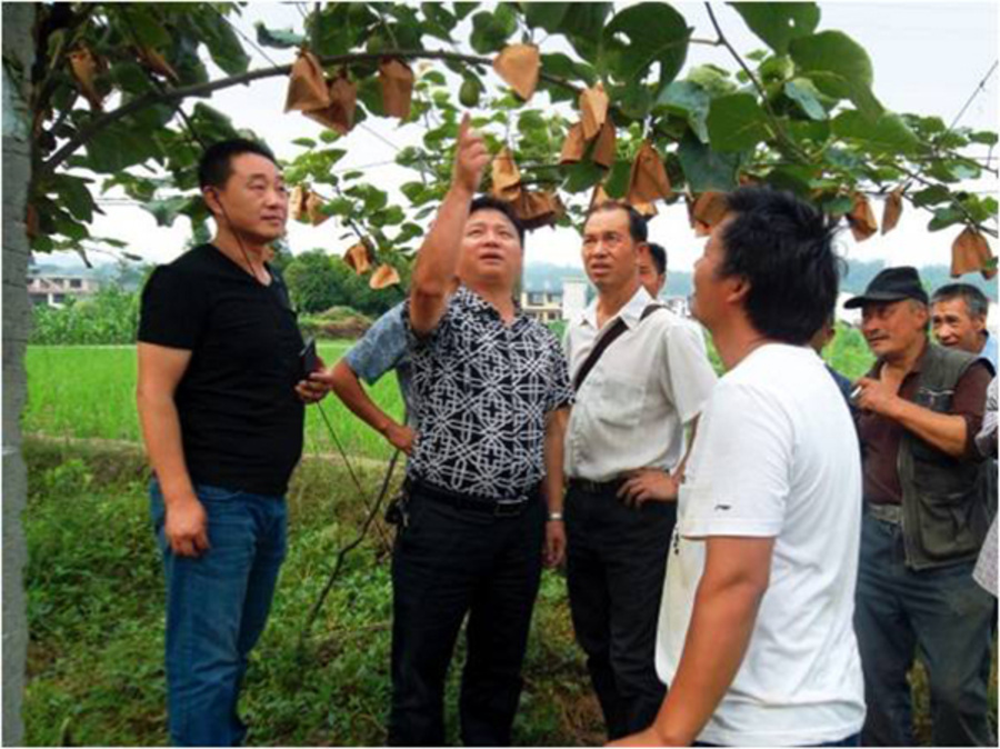 胡锦(左二)现场指导果农学习猕猴桃种植技术。