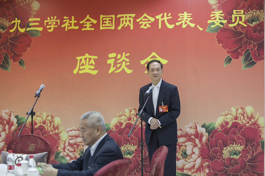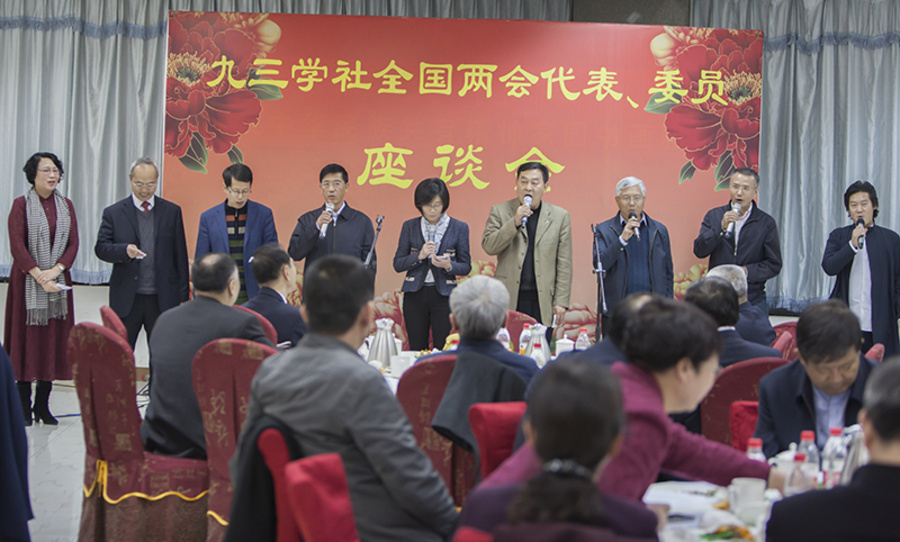 参加全国两会的九三学社代表委员,在中央社会主义学院参加培训的九三学社学员近100人出席座谈会。(胡超)