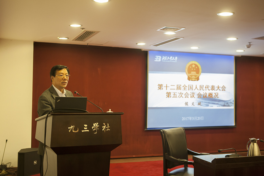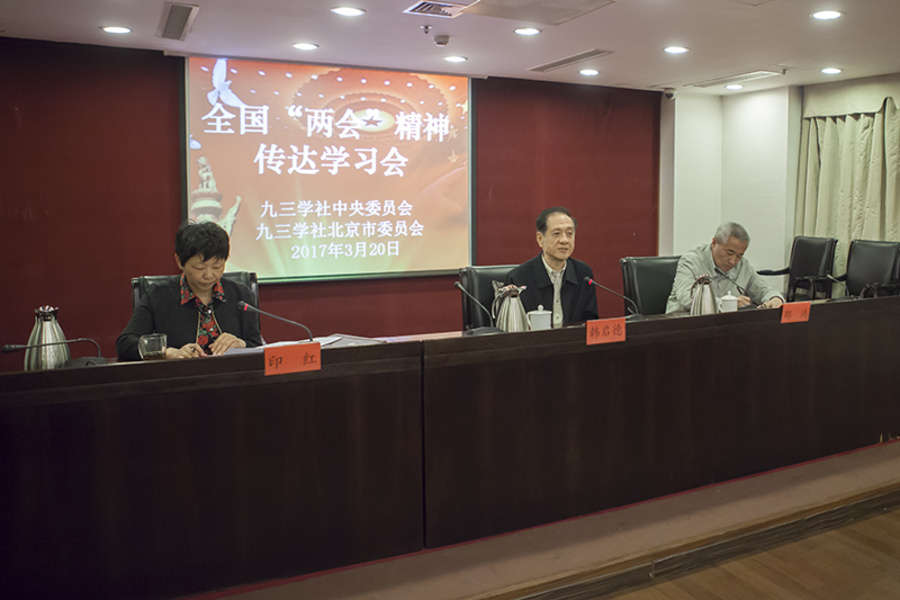 3月20日下午,九三学社中央与九三学社北京市委在京联合召开全国两会精神传达学习会。全国政协副主席、九三学社中央主席韩启德出席会议并讲话。全国政协常委、九三学社中央常务副主席邵鸿, 全国人大常委、九三学社中央委员侯义斌分别传达全国政协十二届五次会议和十二届全国人大五次会议精神。全国政协常委、九三学社中央副主席印红主持会议。