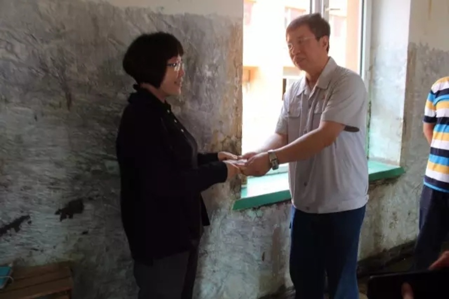 18日,九三学社吉林市委主委鲁建春、监督委员会主任郁秉孝、秘书长吴春梅及机关全体干部来到丰满区二道乡金丰村明智之家,慰问受灾社员王丽英。