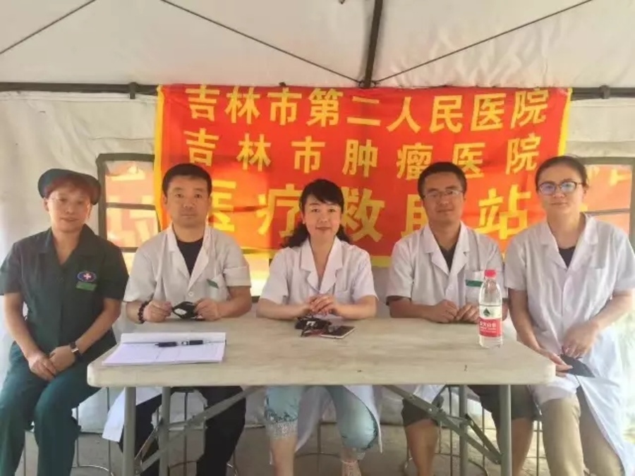 九三学社社员、吉林市天河医院院长常刚到受灾的旺起镇小石村为村民分发药品,普及灾后防病知识。