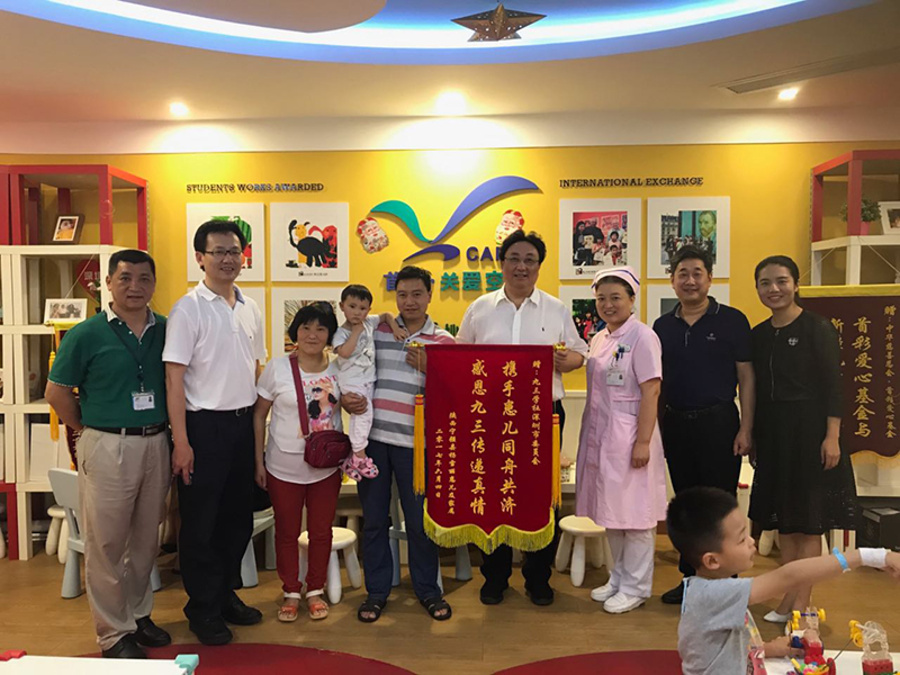 “携手患儿同舟共济,感恩九三传递真情”。许建亮夫妇制作了一面锦旗送给前来看望小雪丽的蒋宇扬和九三学社深圳市委副主委聂国辉。