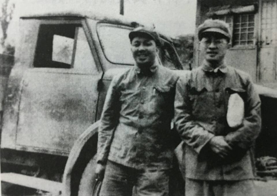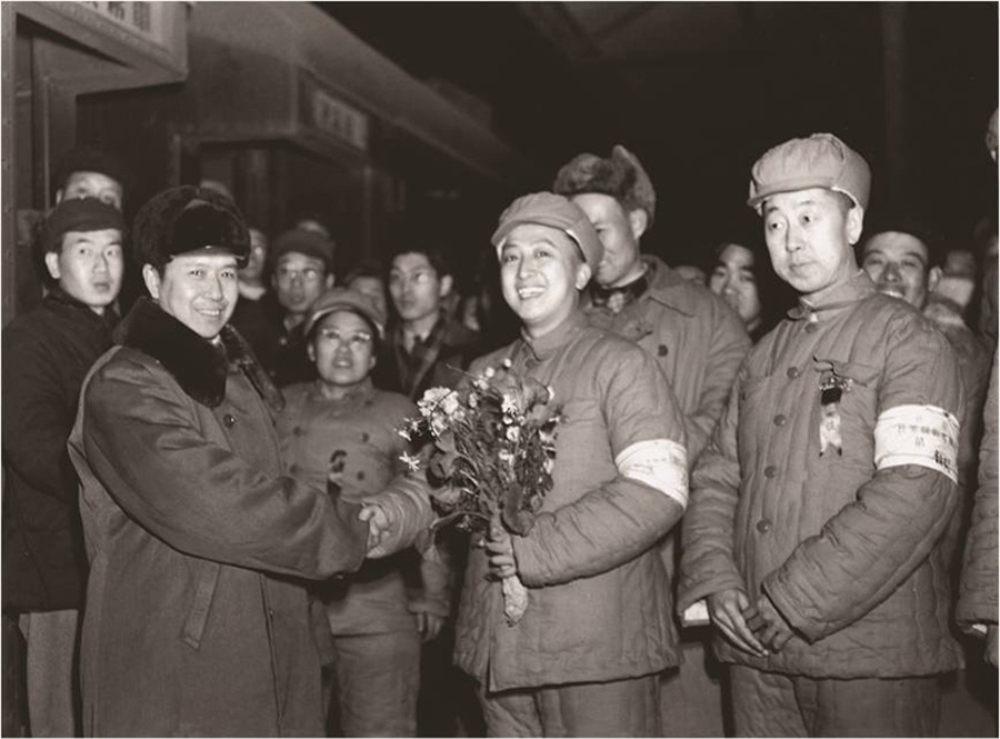 北京市抗美援朝志愿军手术第二队离京时,中央卫生部贺诚副部长、市卫生局张文奇局长等前往车站送行。图为贺诚同志与志愿手术队队长吴阶平握手。