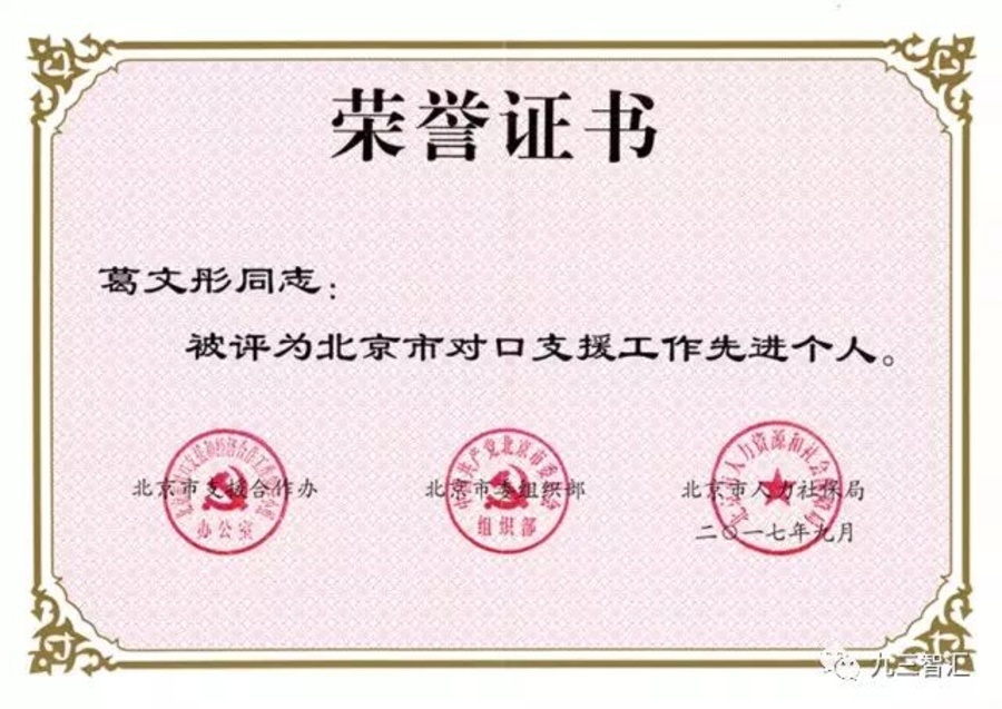日前,北京市对口支援工作表彰大会在北京召开。九三学社北京市委委员、首都医科大学附属北京儿童医院副院长葛文彤被评为“北京市对口支援工作先进个人”。中共北京市委书记蔡奇为先进个人颁奖,并称赞广大援建干部职工树立了北京的良好形象,“不愧是北京人民的好儿女!”