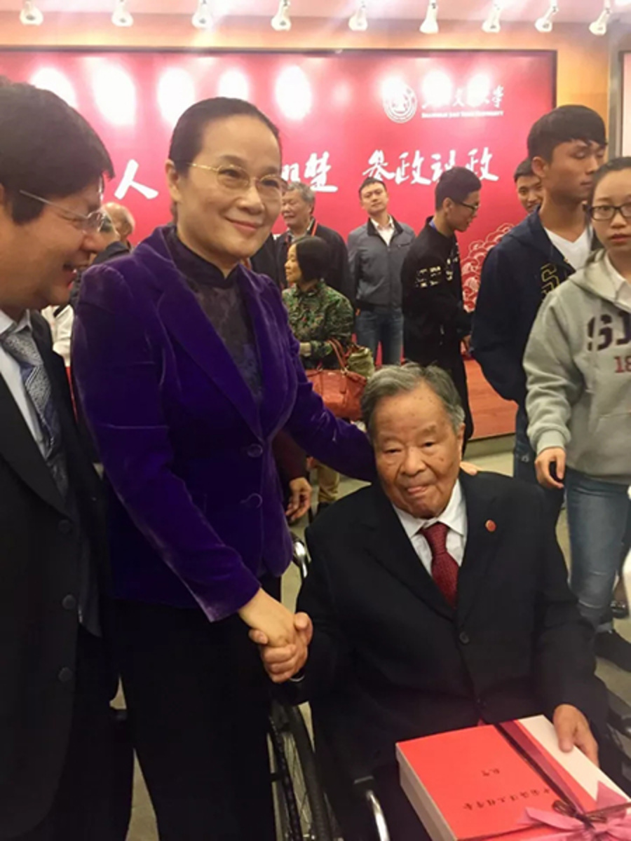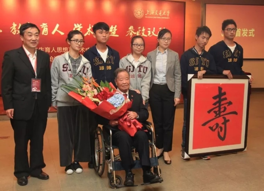 在掌声与祝福中,交大船舶海洋与建筑工程学院学生们向杨槱赠送了礼物,共祝他生日快乐、福寿安康!