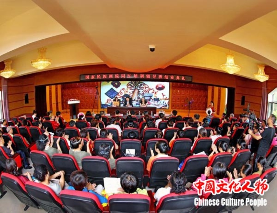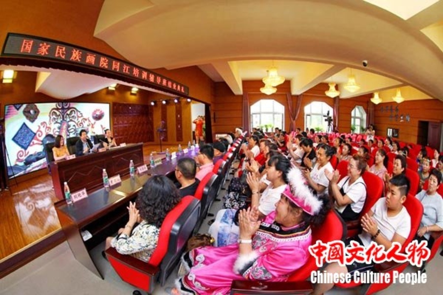 在为期1周的培训期间,国家民族画院组织书画家以鱼皮画主线,在深入调研基础上,加班加点备课,分别从历史文化传承、材料选取处理、颜色搭配、构图技巧、美感培养等方面进行专业细致辅导。老师们走到学员中间示范,学员拿着自己的作品、设计图案向老师请教,认真记录老师的指导意见。不少学员还现场拍照、录音,抓住这一难得的机会努力学习。为了加强沟通和不断学习,老师与学员共同建立了鱼皮画微信群。