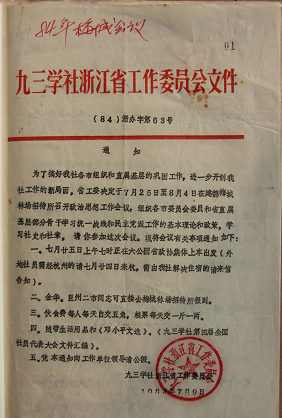 1984年7月25日至8月4日,九三学社浙江省委第一次思想政治工作会议在建德梅城林场招待所召开,与会人员109人。当年10月,九三学社浙江省第一次代表大会召开,选举产生第一届省委会。可以说,思想政治工作会议的历史比九三学社浙江省委还要早几个月!