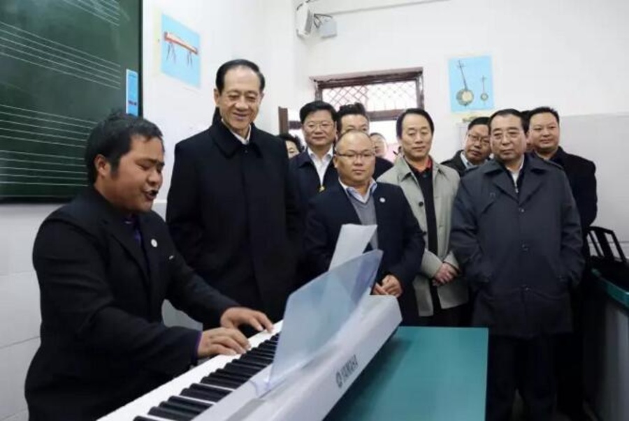 韩启德主席在九三中学考察调研时,倾听教师演唱原创歌曲。何欢 摄