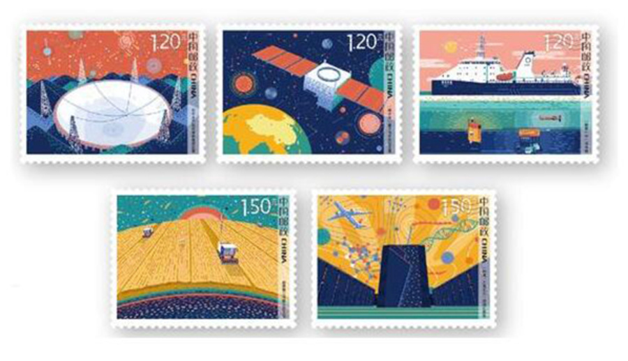 《科技创新》纪念邮票一套5枚,展示了近年来中国以创新驱动发展为主,多个科学领域的探索与成就。另外两枚为“探索一号”科考船、渤海粮仓科技示范工程。全套邮票面值为6.60元。(刘华)