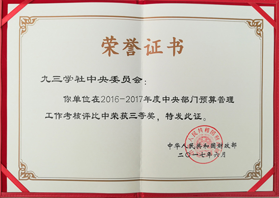 11月8日,在《财政部关于2016年度中央部门决算工作考核情况的通报》(财库函【2017】44号)中,九三学社中央2016年部门决算工作列为级次“优”,是各民主党派中央、全国工商联中唯一列为级次“优”的单位。