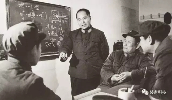 程开甲(左二)与科研人员探讨技术问题。