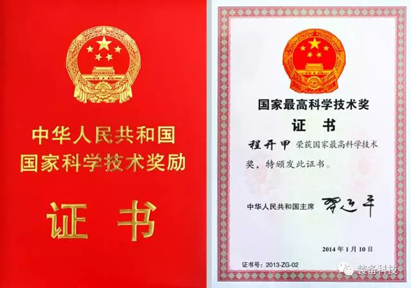程开甲荣获的国家最高科学技术奖证书。
