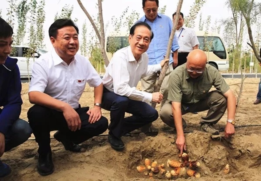 2016年9月6日,韩启德调研九三学社参与『一带一路』倡议社会服务工作,考察九三学社社员、北大药学院屠鹏飞教授在新疆的肉苁蓉种植基地